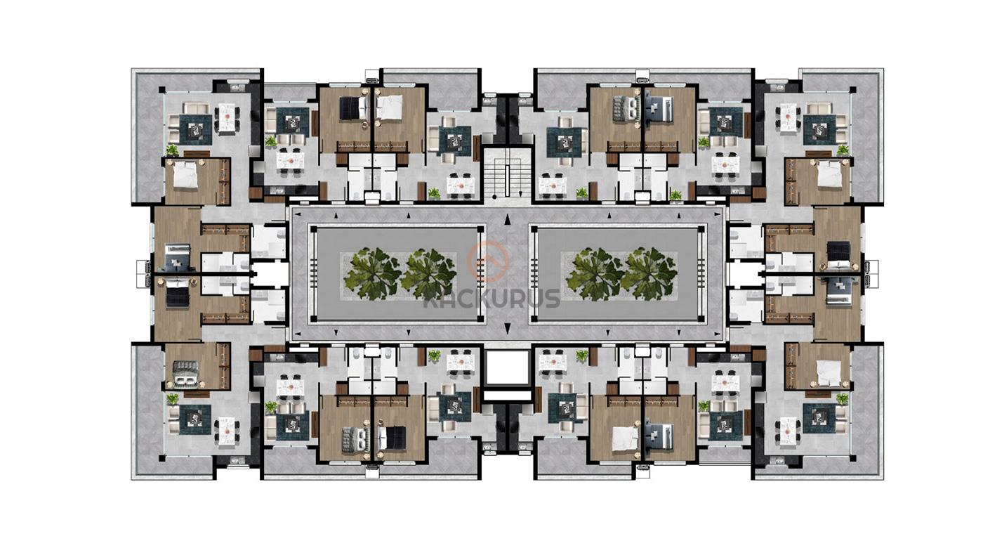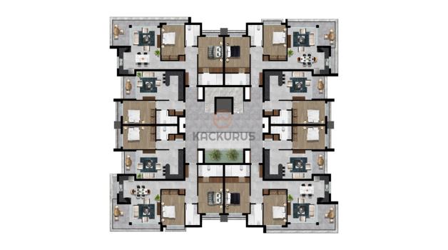 • 5. Kat: 4 daire (2+1) + 4 daire (1+1) – özel çatı teraslı