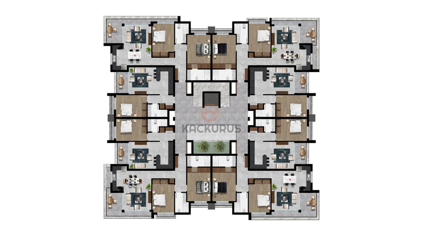 • 2-4. Katlar: Her katta 8 daire (1+1) + 4 daire (2+1)