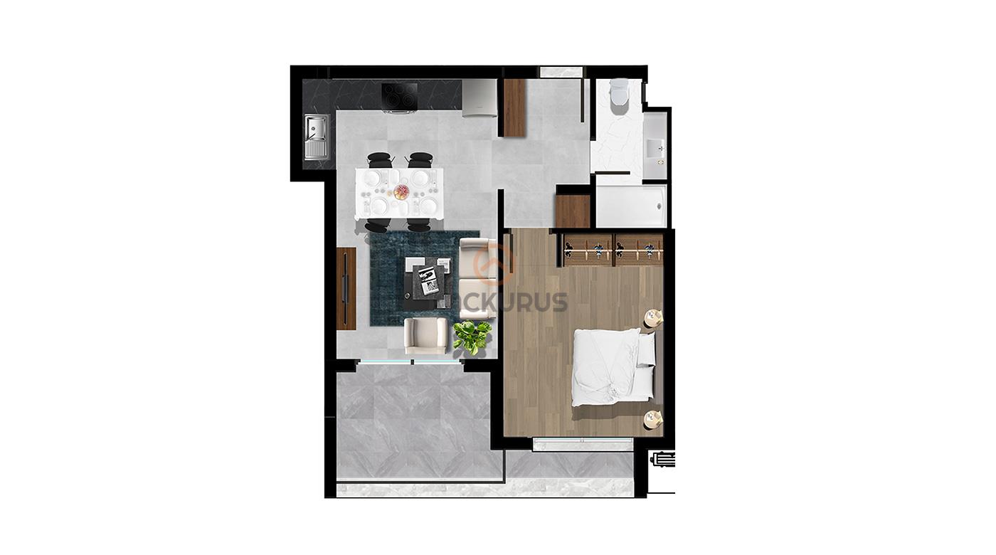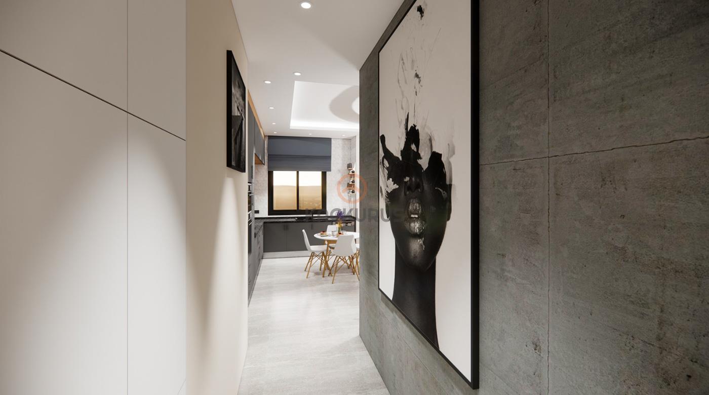 - Salon + Mutfak: 24 m² – Açık plan, modern mutfak tasarımı