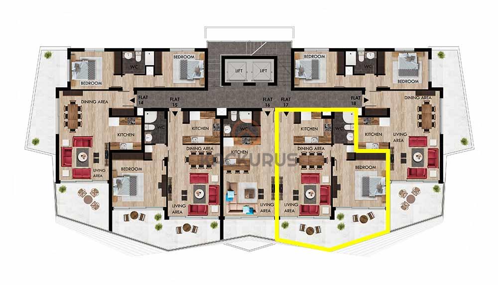 1+1 dairemiz 17,5 m2 geniş balkonuyla altın kumlu ve berrak denizli Long Beach sahiline sadece 550 metre yürüme mesafesinde.