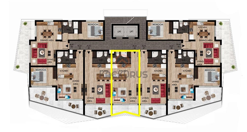 İskele'nin gözde plajı Long Beach’in eşsiz güzelliğiyle bütünleşen lüks projede yer alan 47m² satılık stüdyo dairemiz, 7. katta yer almakta ve 5m² genişliğinde balkona sahiptir.