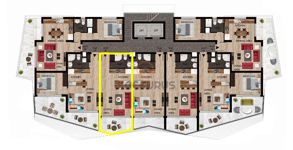 این مجتمع لوکس که به معماری خاص خود و موقعیت ممتازش که از هر واحد چشمانداز بینظیر دریای مدیترانه را دارد، میدرخشد، تنها 550 متر پیاده از ساحل لانگ بیچ، بلندترین و محبوبترین ساحل جزیره، فاصله دارد. آپارتمان استودیوی فروشی دارای بالکنی به مساحت 8.2 مترمربع است.