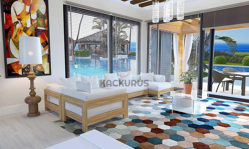 Наша вилла 2+1 - 106м2 с общим частным бассейном имеет панорамный вид на горы Беш-Пармак и Средиземное море, с открытым видом на север, направленным к Средиземному морю.